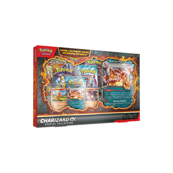 1 etched foil promo card featuring Charizard ex, 2 foil cards featuring Charmander and Charmeleon, 5 Pokémon TCG booster packs, 1 oversize lenticular card, A code card for Pokémon TCG Live.